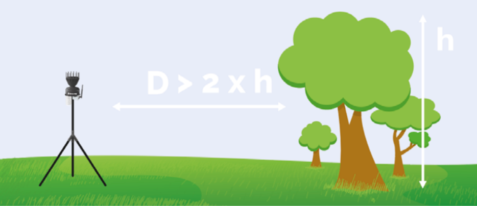 Het station moet op de juiste hoogte worden geplaatst: de plaatsingshoogte en de afstand tot obstakels is bijzonder belangrijk om drift te voorkomen. Bij Sencrop raden wij aan het station te plaatsen met een minimale afstand van 2 keer de hoogte van het eerste obstakel dat zich in de buurt bevindt (heggen, boerderijgebouw, silo, hoogspanningsmast, windturbine).